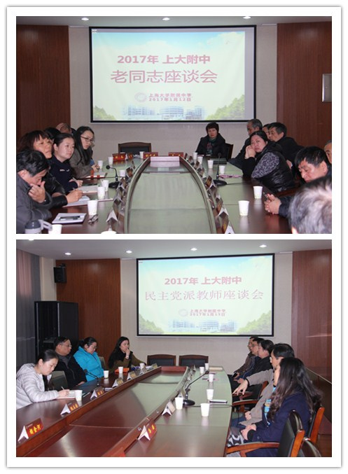 2017年1月12、13日,上大附中分别召开了2017年老同志与民主党派教师座谈会。回眸2016年,展望2017年,老同志们和各民主党派教师就上大附中未来发展畅所欲言,积极建言献策。大家充分肯定了学校在过去一年的工作,同时也直面新形势下学校面临的挑战,提出了许多宝贵的意见和建议。会议由党总支副书记胡艳主持,周晓岚副校长、刘华霞副校长、仇玉婷主席分别出席了座谈会。