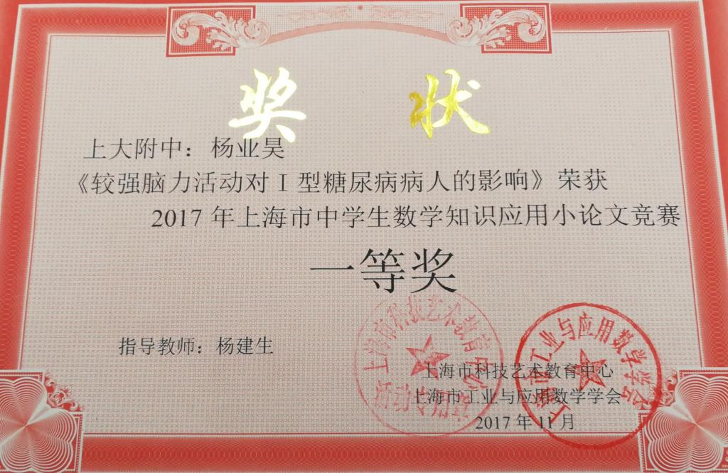 上大附中学生杨业昊获2017年上海市中学生数学知识应用小论文竞赛一等奖