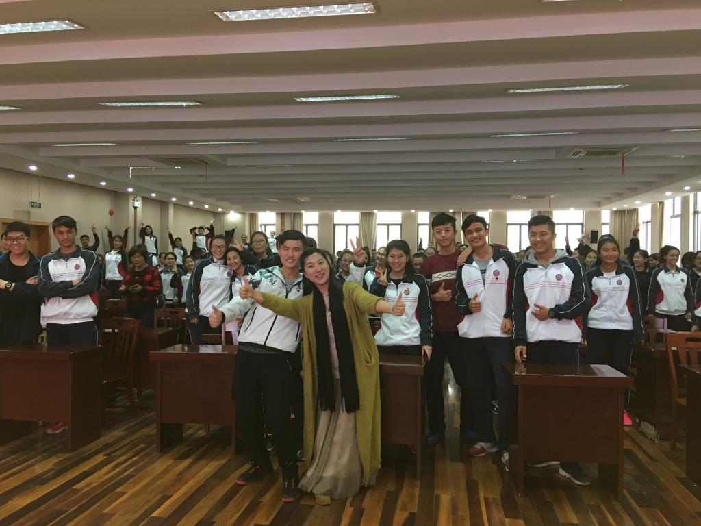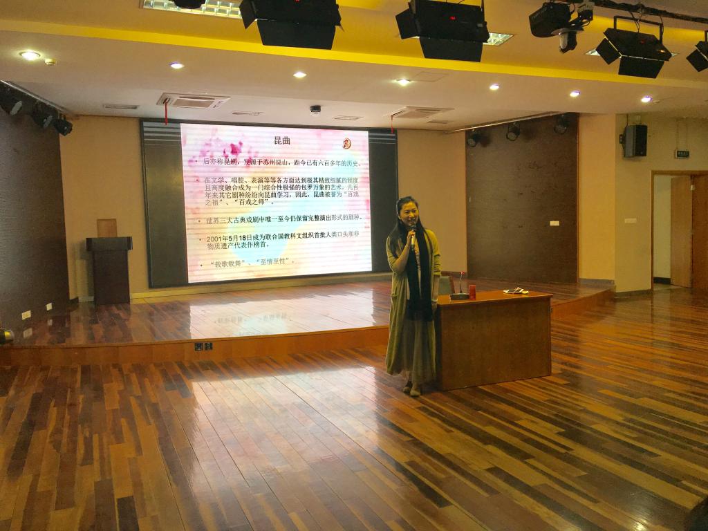 讲座随着一阵热烈的掌声正式开启,沈昳丽老师首先从昆曲的基础知识讲起,和同学们一起分享了她学习昆曲的过程,并对其代表作《牡丹亭》进行细致解读,为同学们详细讲述了昆曲中的词、曲、动作的不同表现和文化含义,并现场清唱了《牡丹亭》中的著名选段《山坡羊》。