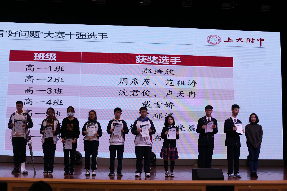 高一年级共提交了200份申报表,在30强选手的终评争霸赛中,经过展示、答辩等环节,本届好问题大赛十强选手脱颖而出。