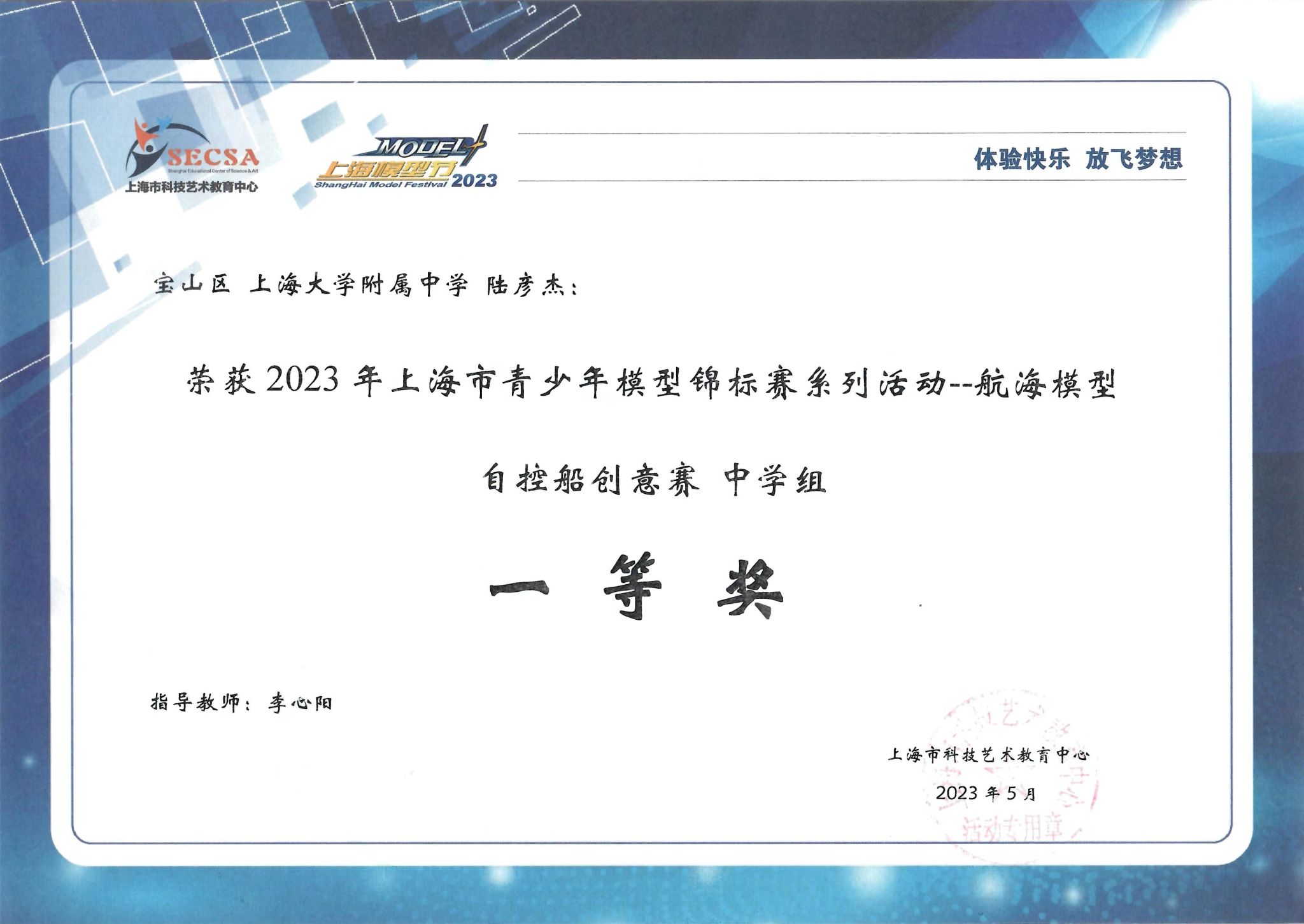 上大附中学子在自控船创意赛项目中成绩优异,在李心阳教师的指导下,高一年级陆彦杰获上海市一等奖,刘业千获上海市二等奖,樊昊隽获上海市三等奖。
