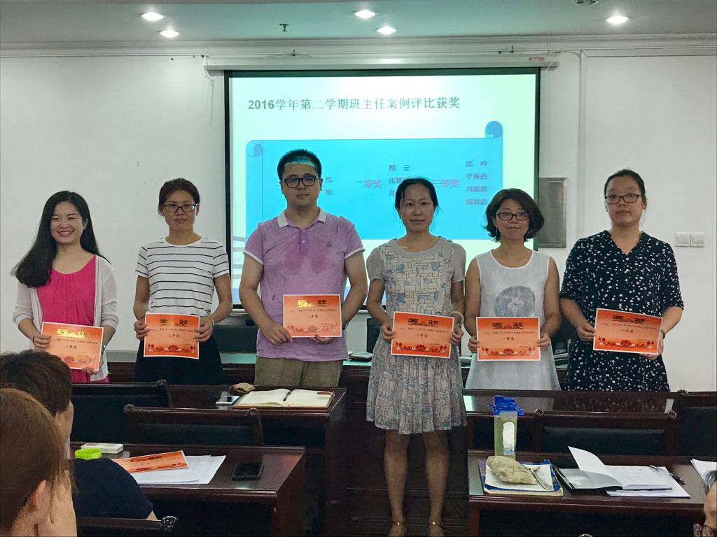 学生处首先对2016学年第二学期班主任案例的获奖教师进行了表彰。孙泓、黄艳获得一等奖;周云、沈雅茜、肖丹获得二等奖;沈吟、李海侠、刘乾琪、戴羽浩获得三等奖。全体成员向上述获奖老师致以热烈的掌声。