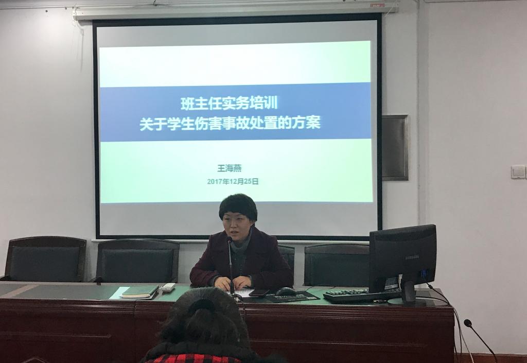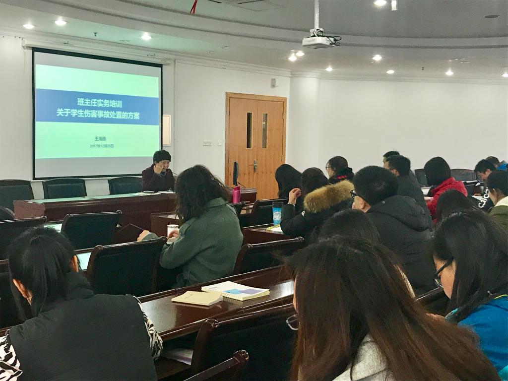 为了提高学生安全保障系数,提升班主任及时有序处置学生伤害事故的能力,2017年12月25日,上大附中学生处组织全体班主任参加校园安全实务培训。