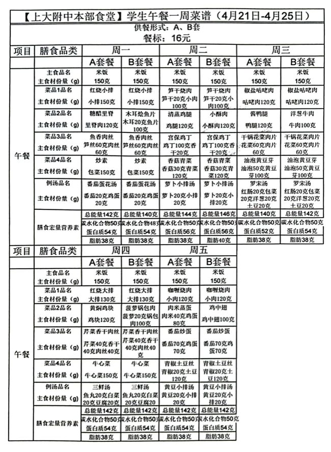 【上大附中本部食堂】学生午餐一周菜谱公示(4月21日-4月25日)