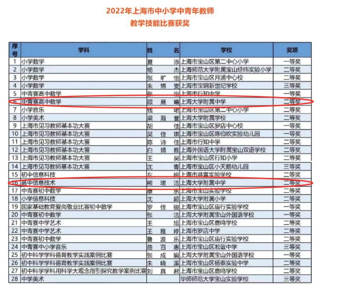 顾晨曦、熊珺洁老师分获2022年上海市中小学中青年教师教学技能比赛高中数学二等奖、高中信息技术二等奖。