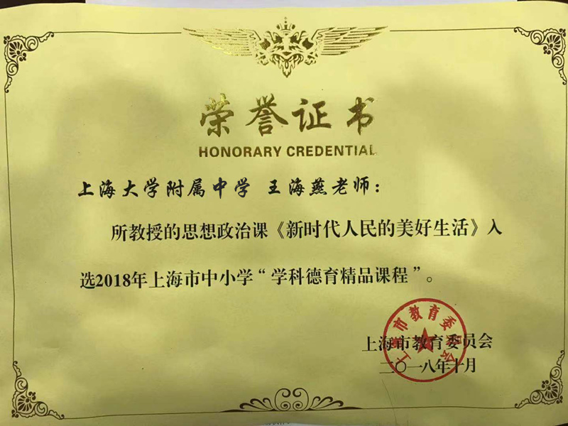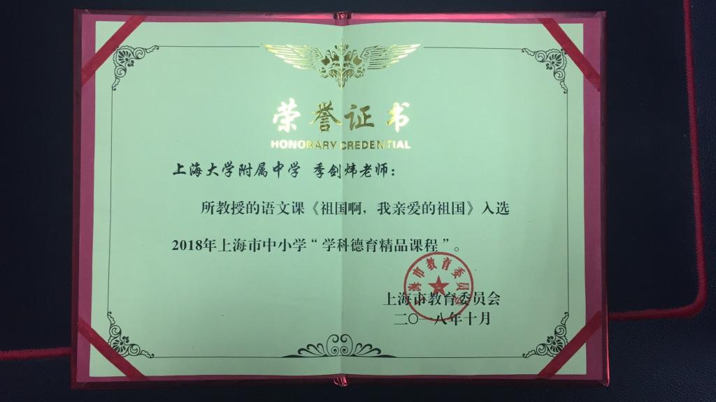 由上海市教育委员会组织的2018年上海市中小学“学科德育精品课程”征集展示活动中,上大附中季剑炜老师的语文课《祖国啊,我亲爱的祖国》、金花老师的思想政治课《我国现阶段的社会保障制度》、刘乾琪老师的思想政治课《经济发展方式——走进美丽宝山》、戴羽浩老师的历史课《社会主义制度的建立》等五节课入选为精品课程。
