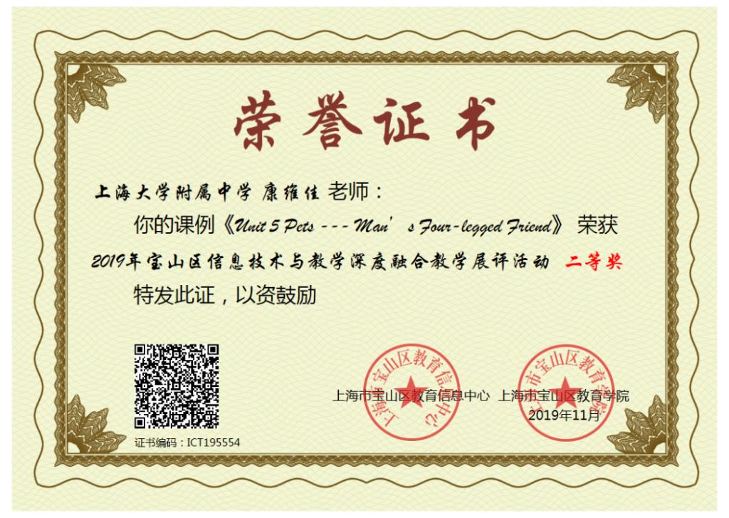 近日,由宝山区教育学院和宝山区教育信息中心联合主办的2019年宝山区信息技术与教学深度融合教学展评活动顺利结束。上大附中刘乾琪、江少芳老师荣获一等奖,康维佳老师荣获二等奖,戴羽浩老师荣获三等奖。